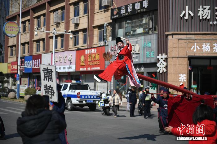 2月18日(阴历年夜岁首年月两),安徽省蚌埠市固镇县新秋民风踏街举动开幕,12个特点圆阵顺次上台,锣饱声声中绝隐新秋怒气。图为安徽省第4批省级非物资文明遗产代替性名目独杆轿明相踏街举动。中新社记者 赵强 摄