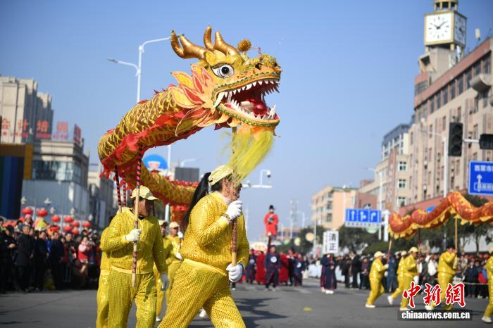 2月18日(阴历年夜岁首年月两),安徽省蚌埠市固镇县新秋风俗踏街举动开幕,12个特性圆阵顺次入场,锣饱声声中绝隐新秋怒气。图为舞龙演出。中新社记者 赵强 摄